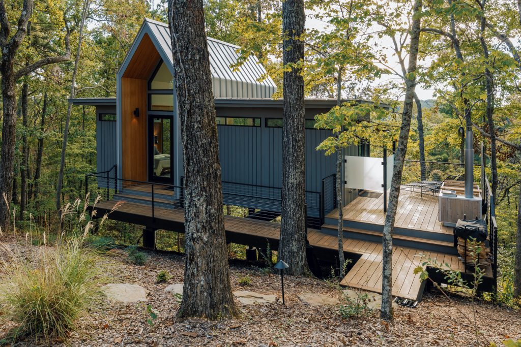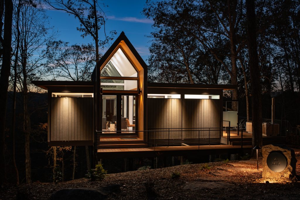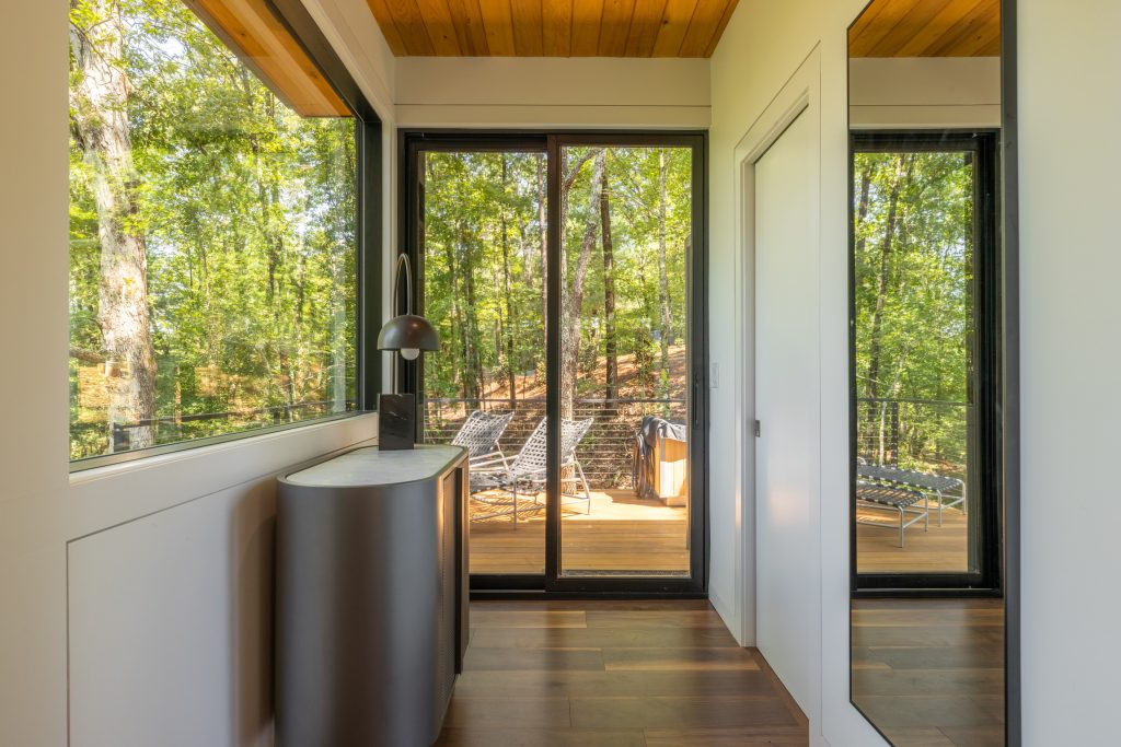 Designed by Bob Butler of Profile + Principle, this Landscape Hideaway is a one-of-a-kind Scandinavian wonder. It is cantilevered on all sides and, since it is built on piers, it has the feeling of floating in the trees.